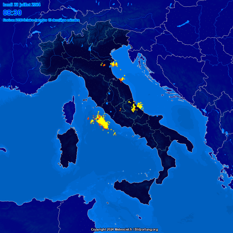 Si notano due zone fortemente temporalesche: il medio Tirreno e il medio Adriatico, ma per il momento i fenomeni più intensi sono relegati al mare aperto. Nell’arco della giornata i temporali sul mare tenderanno a spegnersi mentre prenderanno vigore nelle aree interne dell’Italia centro-meridionale.