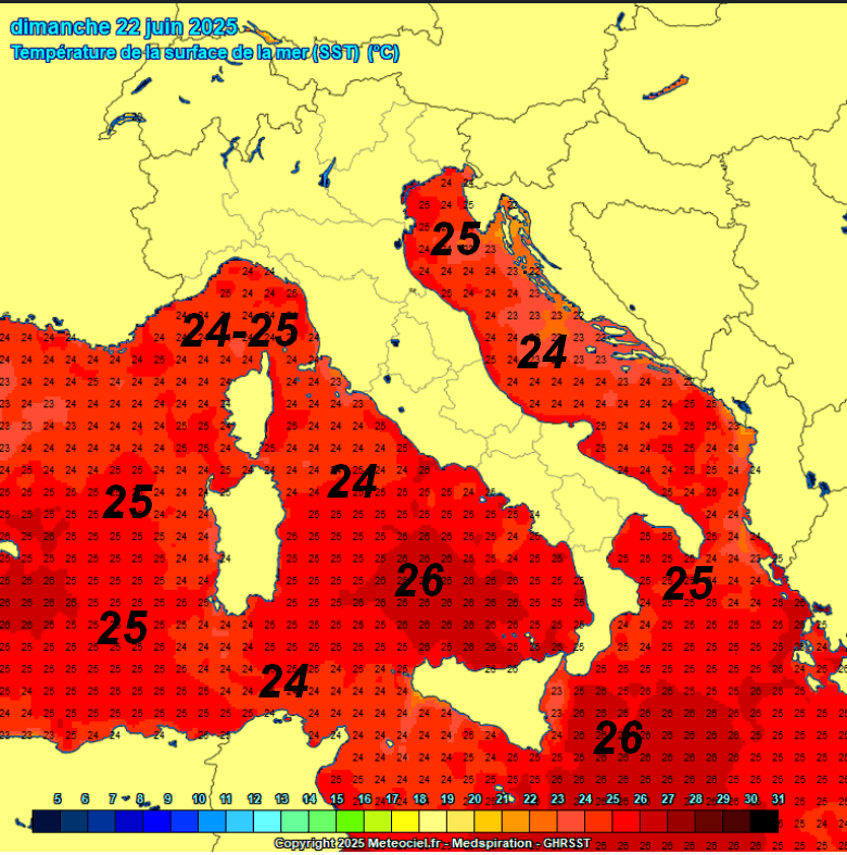 MARI TROPPO CALDI: in alcune aree, ad esempio il Mar Ligure, i valori di superficie si attestano tra i 4 ed i 5° superiori alla media del periodo. Segnaliamo punte di 26° superficiali sul basso Tirreno e sullo Ionio, 25° si registrano invece su molte aree marittime italiche.