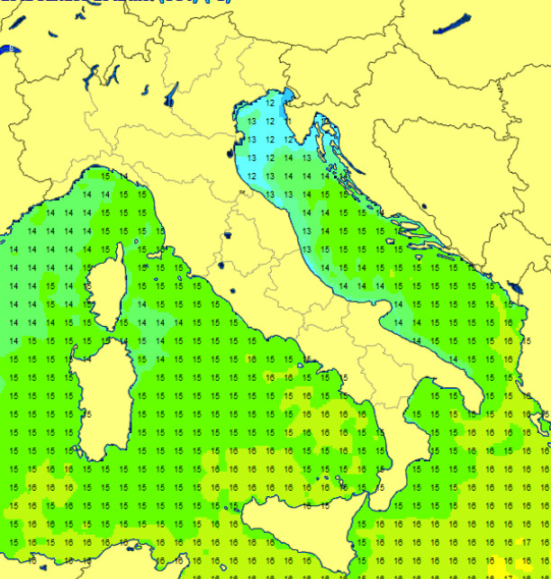 Valori compresi tra 12 -13° dell’alto e medio Adriatico ed i 16° del Canale di Sardegna, il basso Tirreno, lo Stretto di Sicilia e il Mar Ionio.