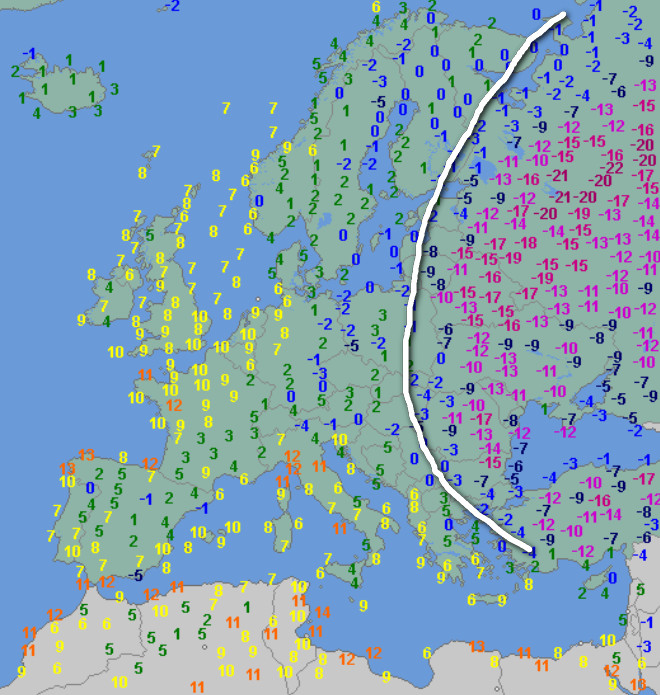 Come era nelle attese, il gelo è stato marginalizzato tra l’Europa orientale e la Vicina Russia, ma resta piuttosto intenso con punte di -20/-22°. Sul resto d’Europa invece è primavera.