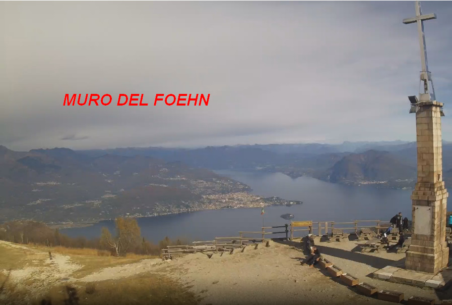 Quest’oggi è ben visibile da qualsiasi località della Pianura Padana. Si tratta di una formazione nuvolosa compatta che nasconde la cima delle Alpi. E’ il risultato dello sconfinamento delle precipitazioni che agiscono oltre le Alpi in seno a correnti settentrionali. Sul versante sottovento alla catena alpina l’aria si secca e l’addensamento nuvoloso si dissolve più a sud. Da lontano sembra una formazione nuvolosa statica, in realtà è in continuo movimento. Nella foto, il muro del Fohen visto dal Mottarone, nei pressi del Lago Maggiore: mottarone.html