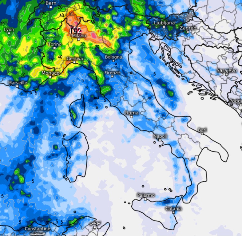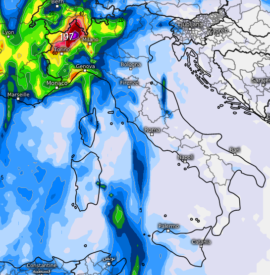 Infine un altro modello di cui si parla poco (Access) ma che conferma invece l’ipotesi piovosa del modello europeo, pur limitandola soprattutto al nord-ovest, con accumuli anche prossimi ai 200mm tra Verbano-Cusio ed Ossola:
