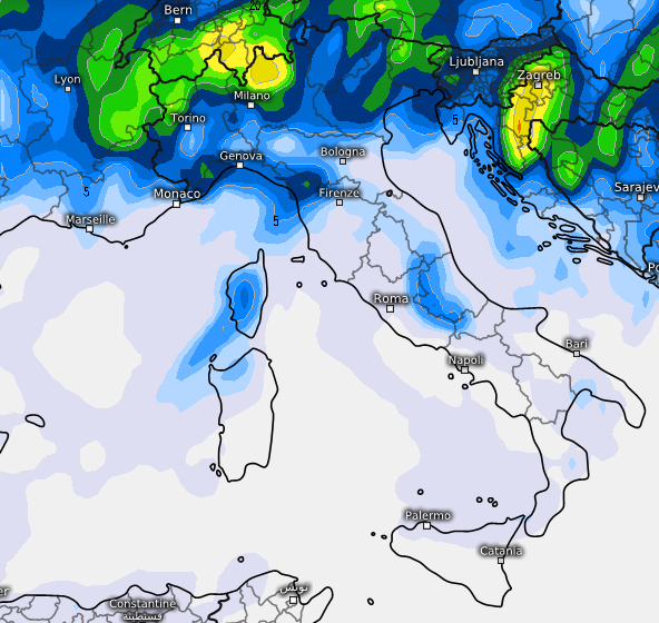 Il modello americano è invece più prudente e segnala accumuli molto meno generosi, che coinvolgeranno prevalentemente l’alta Lombardia, la Valle d’Aosta, l’Ossola e parte della montagna friulana: