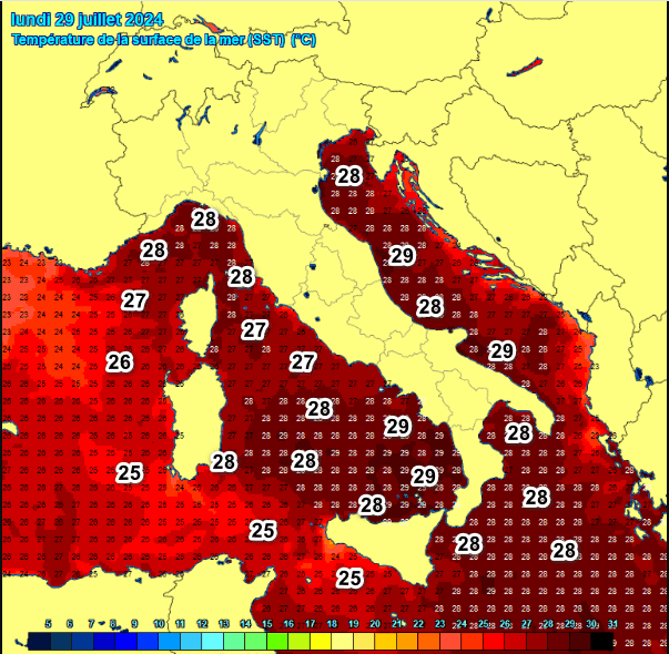 Queste sono le temperature dei mari che circondano l’Italia rilevate nella giornata di ieri, lunedi 29 luglio: