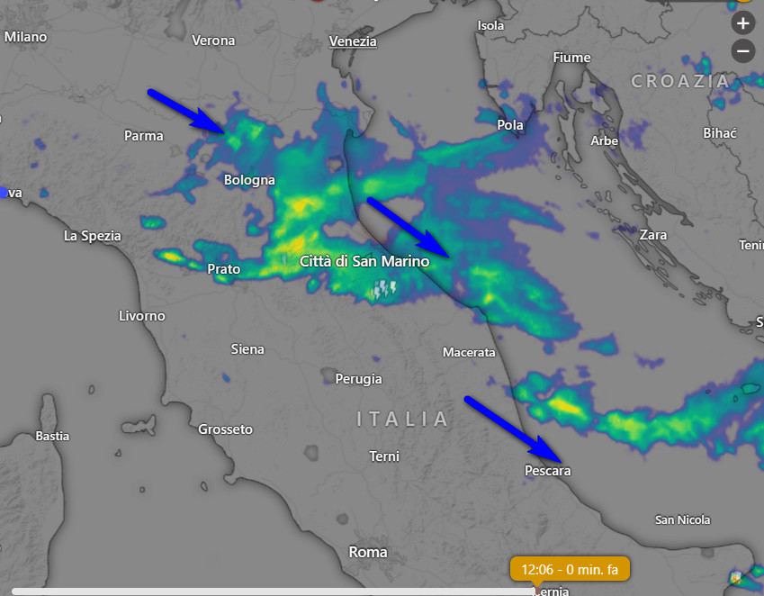 Si segnalano rovesci e temporali tra la Romagna e le Marche, in spostamento nelle prossime ore verso sud-est. Qualche rovescio è attivo anche in prossimità del Gargano, per il resto il tempo si presenta asciutto.