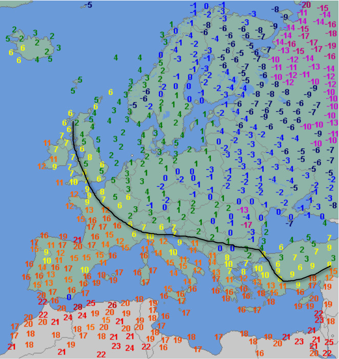 GELO anche di giorno sui Paesi dell’Europa orientale e la Vicina Russia. Più ad ovest invece è primavera con 21° in prossimità del Golfo d Biscaglia. Notate il limite abbastanza sottile che separa il GELO dalla PRIMAVERA.