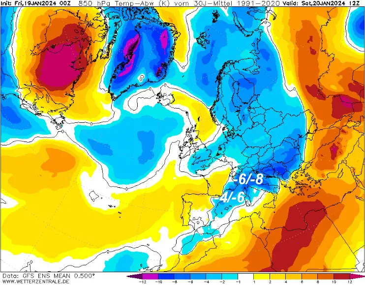 Durerà poco, ma la giornata di domani, sabato 20 gennaio, sarà la più fredda (fino ad ora) di questa sciagurata stagione invernale in Italia. La mappa mostra le anomalie termiche a 1500 metri attese in Italia nelle ore centrali di sabato 20 gennaio. Notiamo punte al ribasso comprese tra 6-8° rispetto ai valori normali su gran parte delle nostre regioni centro-settentrionali; tra 4 e 6° sotto media invece sul Mediterraneo occidentale. Il freddo a livello del suolo verrà accentuato dalla notevole ventilazione settentrionale.