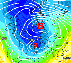 Il perno della depressione si muove dalla costa Azzurra in direzione del Golfo Ligure, dove determina un intenso richiamo di correnti fredde da NE che contribuiscono ad alimentarlo ulteriormente. Fin tanto che le correnti occidentali non troveranno la forza di farlo muovere, il minimo rimarrà bloccato sul posto, determinando condizioni di marcato maltempo al settentrione e in inverno copiose nevicate.