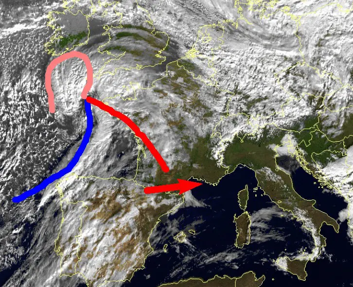 L’ultima immagine satellitare nel campo del visibile ci mostra la perturbazione che interesserà il nord e parte delle regioni centrali nella giornata di domani, venerdi 5 gennaio. Il sistema frontale si apre a compasso tra il vicino Atlantico e la Penisola Iberica con il fronte caldo ben distanziato dal fronte freddo. Questo significa che il fronte è ancora “giovane” ed in grado di dispensare intense precipitazioni lungo il suo percorso. Inizierà ad agire sul nord-ovest nella mattinata di domani, per poi estendere la sua influenza a tutto il nord e l’alto Tirreno entro la serata.