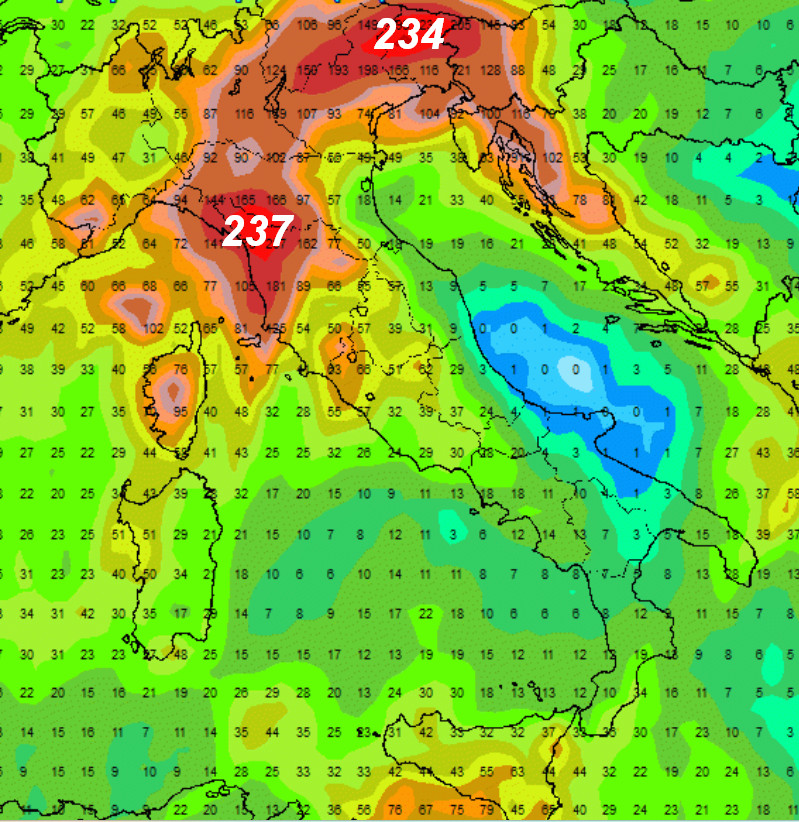 Massima attenzione all’Appennino Tosco-Emiliano dove il modello prevedono 237mm di pioggia e il Friuli Venezia Giulia dove si prevedono 234mm. Si tratta di stime approssimative e da non prendere come oro colato, ma sanciscono la possibilità di eventi intensi in questi due settori italici da oggi fino alla metà del mese.