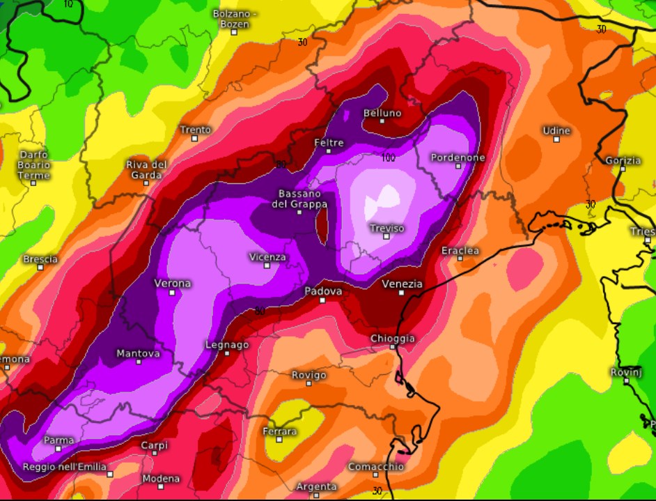 Valori di oltre 100mm di pioggia fra Parma, Verona, Vicenza, Treviso e Pordenone.