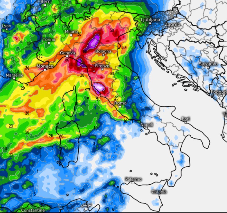 Attesi accumuli anche superiori ai 150mm di pioggia, a causa soprattutto dell’origine marittima dei temporali.