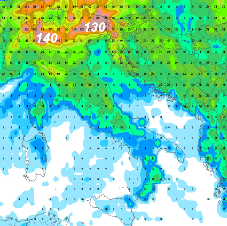 Punte di 140mm sulle Alpi Lombarde e 130mm sul Triveneto. Sulle Isole e sui gran parte del meridione piogge praticamente assenti.