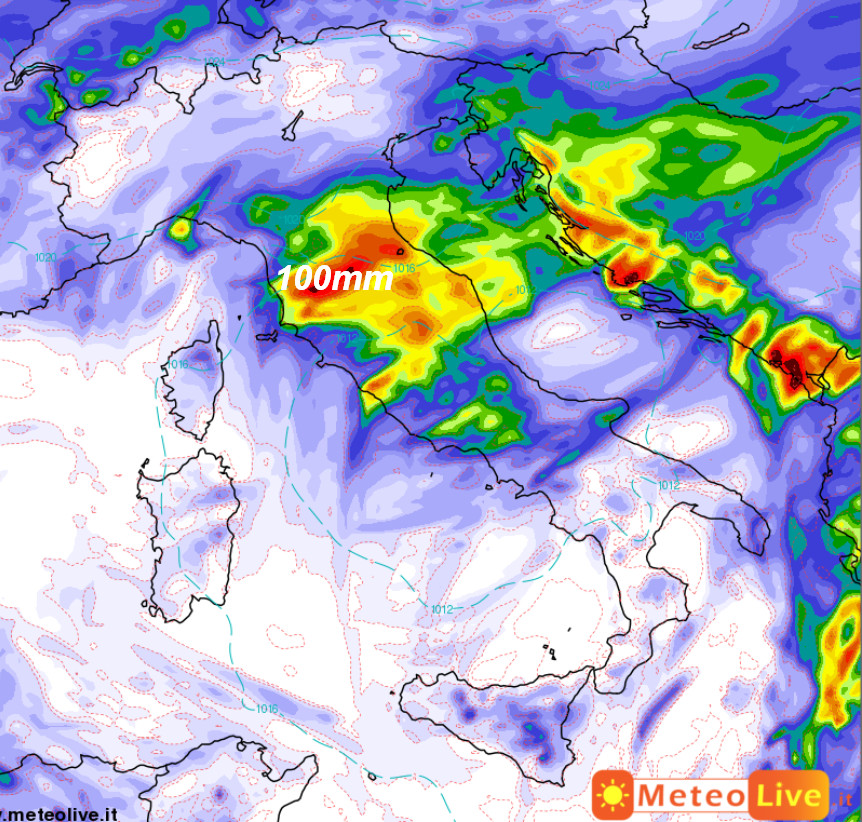 Piogge intense soprattutto al centro con punte attorno a 100mm nelle aree interne della Toscana ed in prossimità dell’Appennino Romagnolo. Piogge intense anche su Marche, Umbria, Abruzzo settentrionale e zone interne del Lazio.