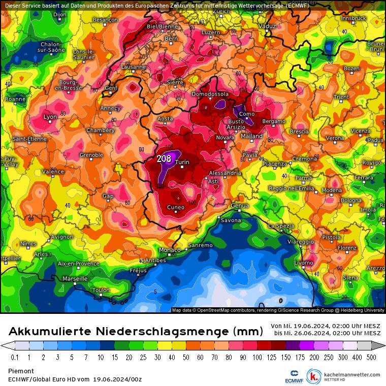 Si tratta di precipitazioni davvero rilevanti per il periodo. Si potrebbero superare i 200 mm in prossimità delle Alpi occidentali, in particolare nel Torinese, ma anche nella provincia di Como e Verbania.