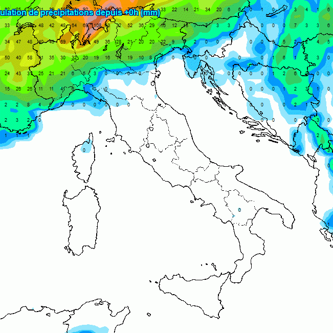 Queste sono le piogge attese in Italia nei prossimi 6 giorni, quindi fino a mercoledi prossimo, secondo il modello americano: