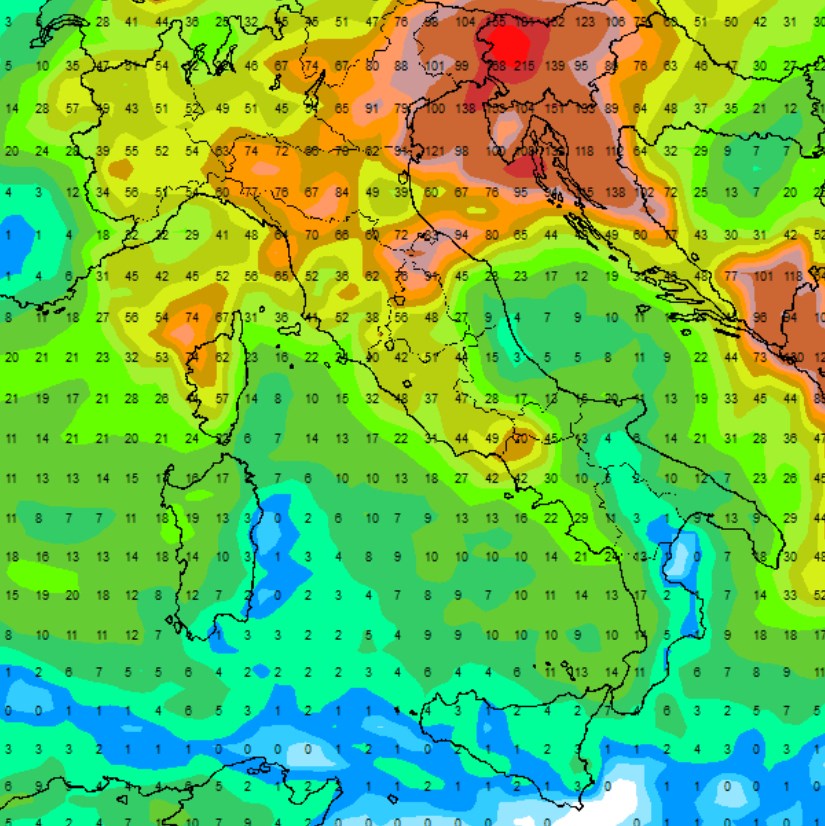 Emilia-Romagna, Veneto, Friuli, alta Toscana e nord Marche saranno le aree che probabilmente riceveranno più pioggia nei prossimi 6 giorni, ma come si evince dalla mappa pioverà un po’ su tutta l’Italia, anche se scarsamente sulla Sardegna orientale, sulla Sicilia, sulla Calabria Jonica e sulla Basilicata, almeno secondo il modello GFS.