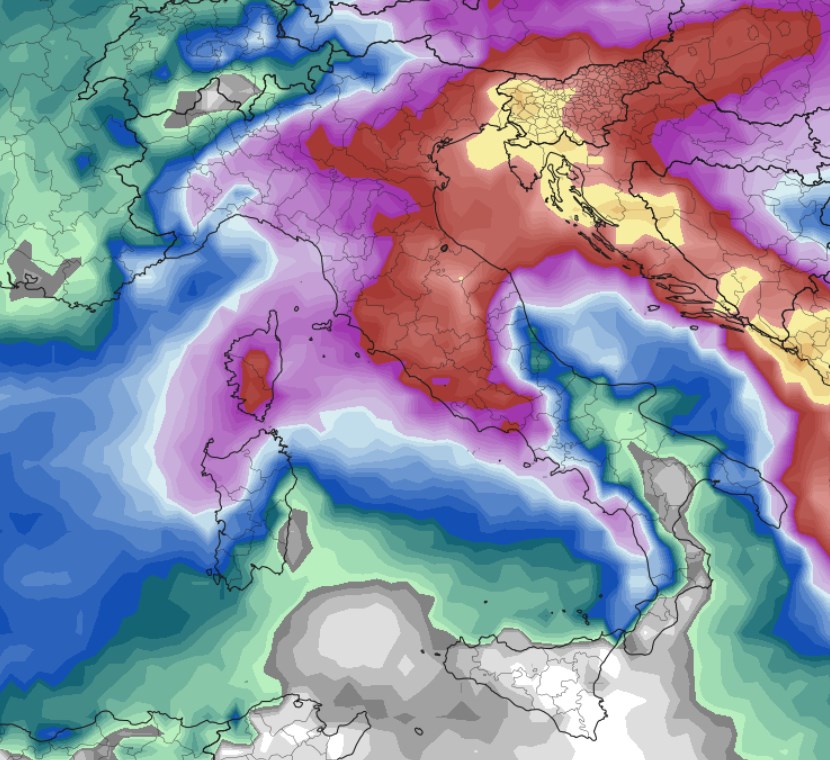 Le regioni più esposte e quindi colpite da piogge più intense e abbondanti saranno est Lombardia, Veneto, Friuli, Toscana, Ubria, Lazio e Marche. Il Friuli, in prossimità del confine con la Slovenia, potrebbe essere interessato da nubifragi. Questa mappa ha un’affidabilità lievemente superiore a quella precedente poichè tiene conto di molti possibili scenari.