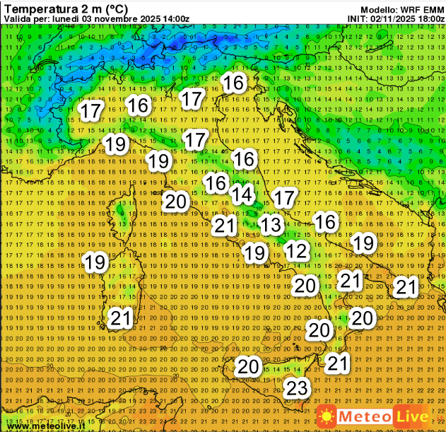 Temperature in aumento al nord ed in calo al meridione. Punte di 23° sulla Sicilia meridionale. Valori nel complesso gradevoli.