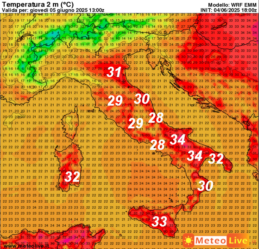 Punte di 34° sulla Puglia e sulla Lucania, 33° in Sicilia, 32° su Sardegna meridionale e Salento, 31° sulla Romagna e 30° sulle Marche e la Calabria Ionica. Valori più freschi sui settori centro-occidentali del nord.