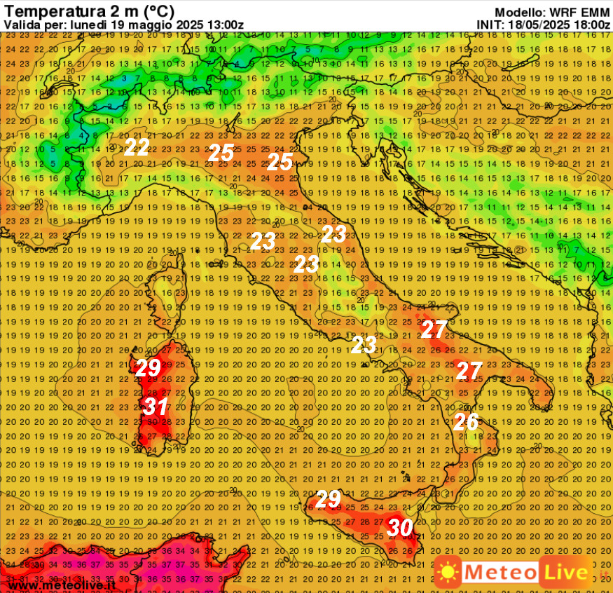 Questo è il quadro delle temperature previste in Italia alle ore 15 di lunedi 19 maggio – si consiglia di ingrandire l’immagine per avere un migliore riscontro visivo: