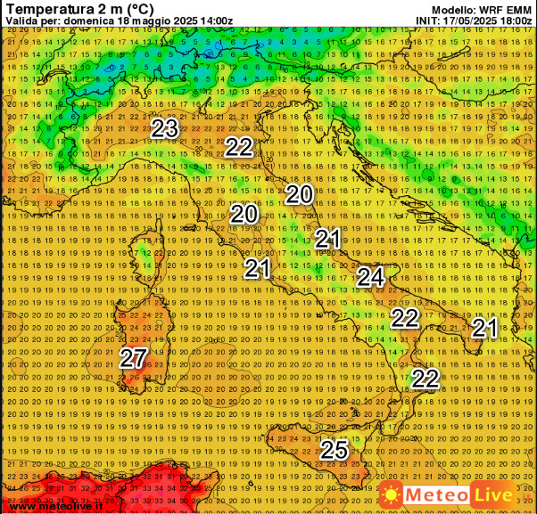 Questo è il quadro delle temperature attese in Italia alle ore 16 di domenica 18 maggio – si consiglia di ingrandire l’immagine per avere un migliore riscontro visivo.