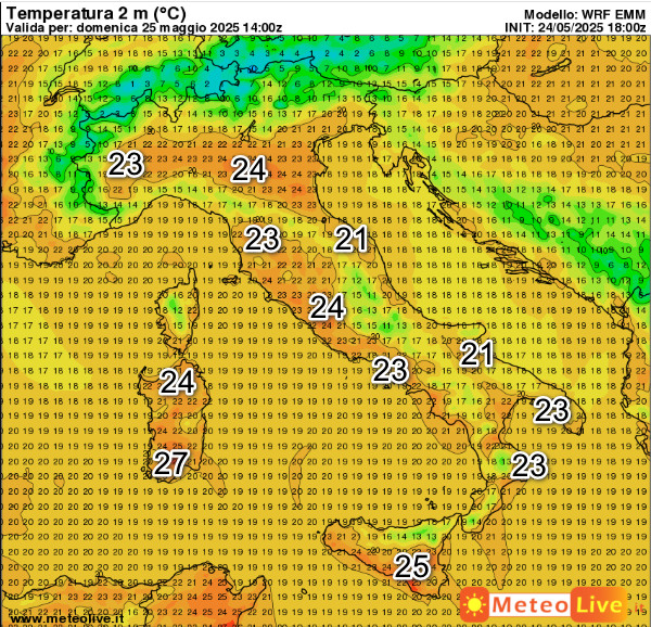 Temperature gradevoli un po’ ovunque. Punte di 27° nel sud della Sardegna, 25° in Sicilia e 24° sulla Pianura Padano-Veneta.