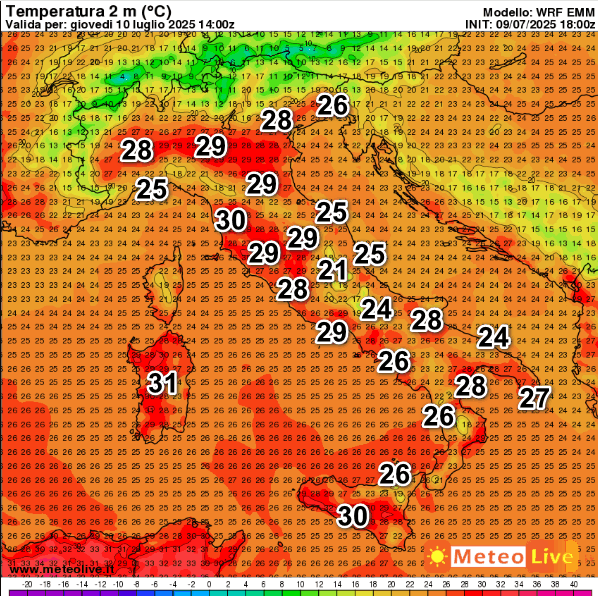 Valori rientranti nella media climatologica del periodo o leggermente al di sotto. Punte di 31° in Sardegna e 30° in Toscana ed in Sicilia, accompagnati da bassi tassi di umidità e conseguente benessere fisico.