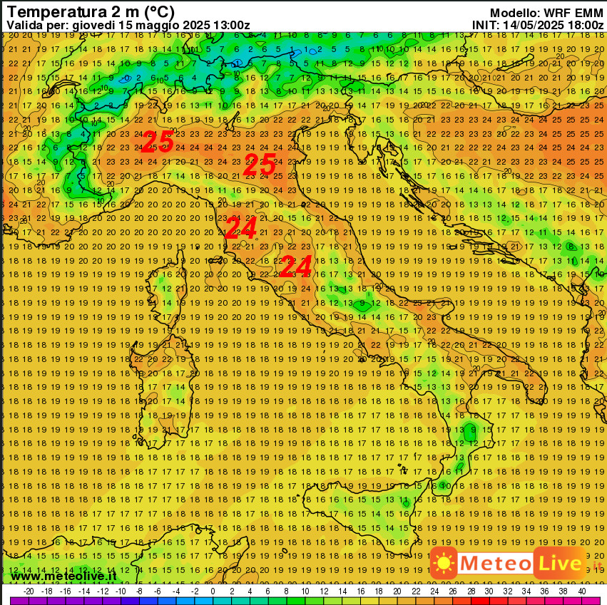 Queste sono le temperature attese in Italia alle ore 15 di giovedi 15 maggio – si consiglia di ingrandire l’immagine per avere un migliore riscontro visivo: