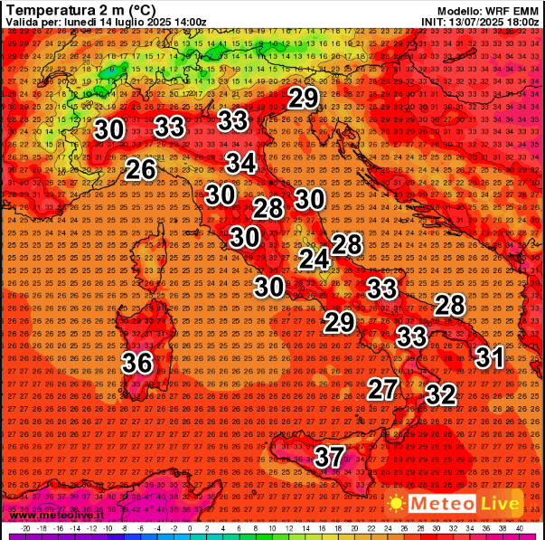 Le TEMPERATURE attese in Italia alle ore 16 di lunedì 14 luglio
