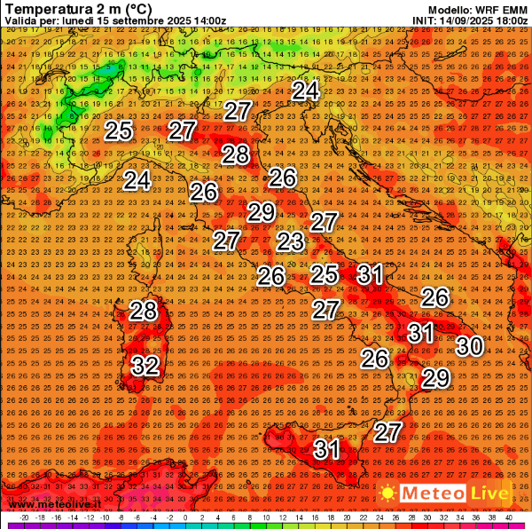 Le TEMPERATURE attese in Italia alle ore 16 di lunedi 15 settembre