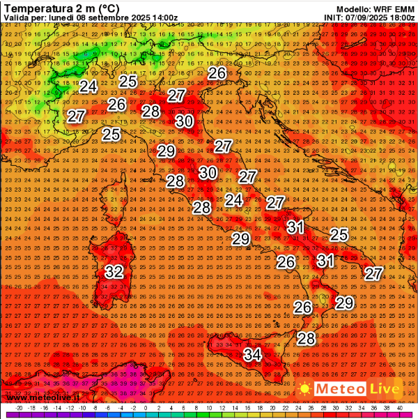 Punte di 34° in Sicilia, 32° sulla Sardegna, 31° sulla Lucania e il Foggiano; 30° sulla Romagna e le aree interne dell’Italia centrale.