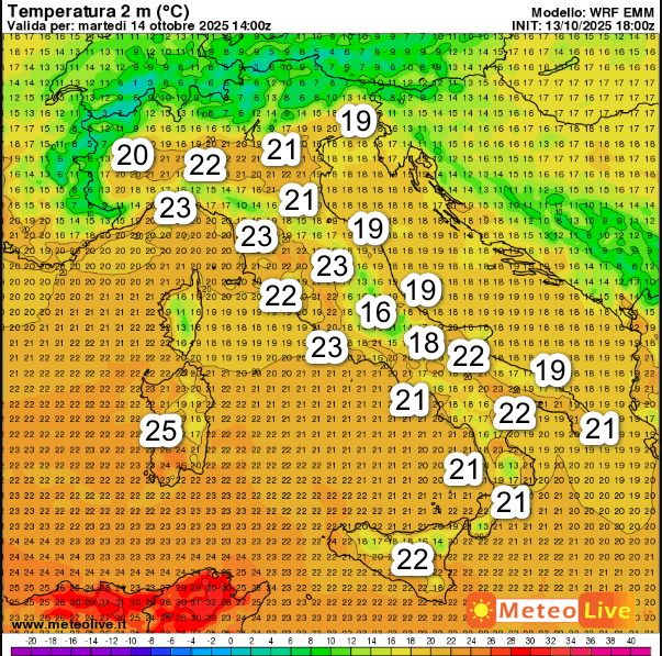 Temperature nel complesso gradevoli ed ancora leggermente al di sopra della media sui settori occidentali. Punte di 25° sulla Sardegna occidentale, 23-24° su Tirreno centro-settentrionale e coste liguri, più fresco il medio-basso Adriatico e le aree interne del meridione con valori anche sotto i 20°.