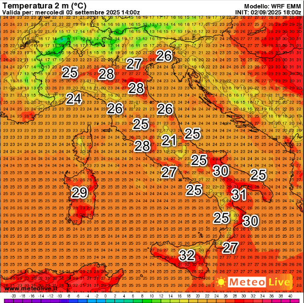 Valori nel complesso gradevoli ed in linea con le medie del periodo. Segnaliamo 32° in Sicilia, 31° sulla Lucania e 30° sulla Calabria Ionica.