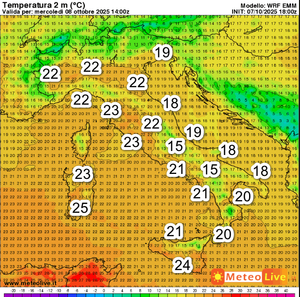 Valori ancora freschi al sud, specie sulla Puglia e nelle aree interne. Temperature molto gradevoli invece sul resto d’Italia con punte di 25° sulla Sardegna meridionale.