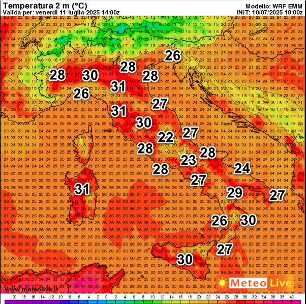 Valori rientranti nella media climatologica del periodo, forse ancora leggermente al di sotto su alcune aree. 31° sono attesi su Sardegna, Toscana ed Emilia Romagna, 30° su Sicilia, Calabria ionica, Umbria e Pianura Lombarda.