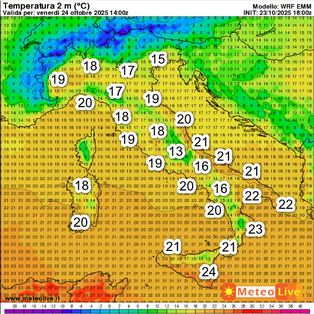 Valori nel complesso gradevoli. Punte di 24° nel sud della Sicilia, 23° sulla Calabria ionica e 22° tra Lucania e Puglia.