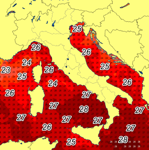 Temperature superficiali piuttosto elevate e comprese tra 24 e 28°.