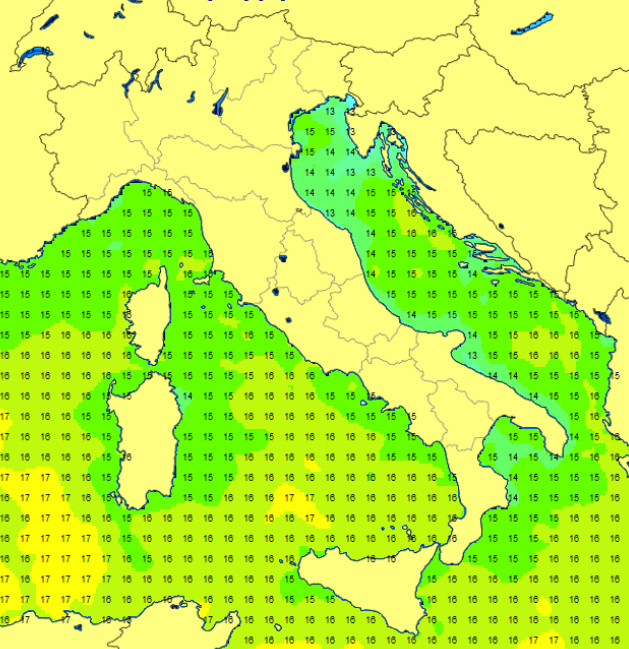 I valori risultano compresi tra i 13-14° dell’alto versante adriatico ed i 17° del basso Tirreno, Stretto di Sicilia e Canale di Sardegna.