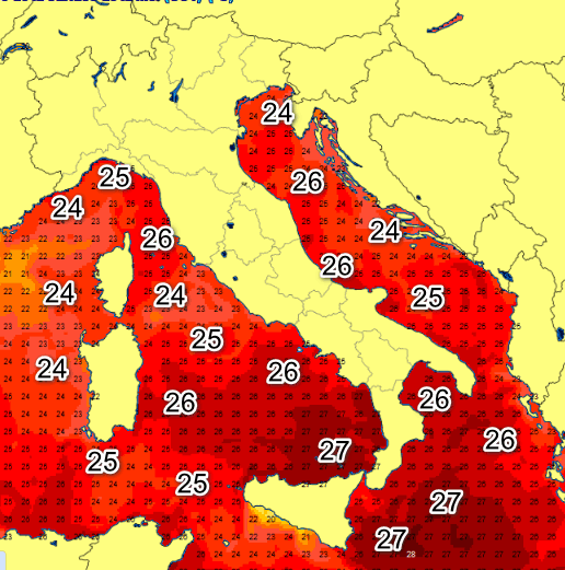 Punte di 27° sono presenti sui bacini più meridionali, per il resto le temperature superficiali risultano comprese tra 24 e 26°.