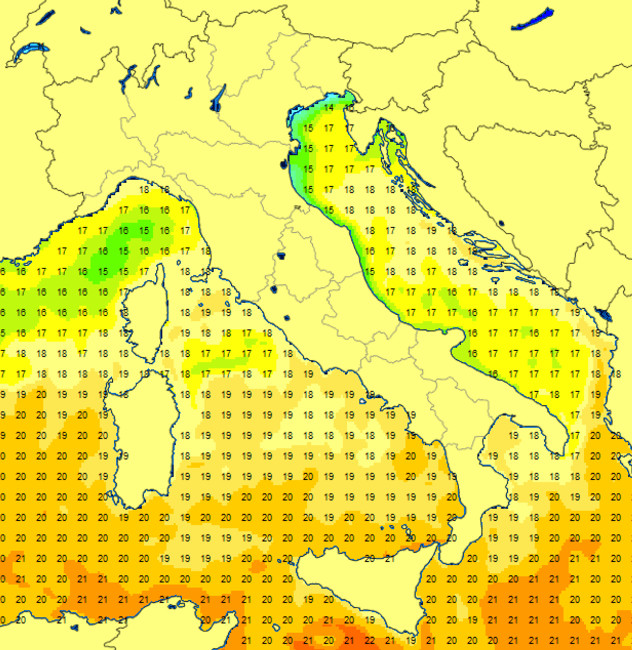 Come si nota dalla mappa, i valori sono compresi tra i 15° dell’alto e medio Adriatico ed i 20-21° dei bacini più meridionali.