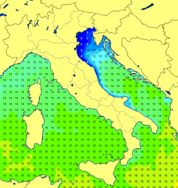 E’ molto freddo l’alto adriatico che ha raggiunto gli 8°. Sul resto d’Italia si va dai 16° dello Ionio ai 13° del Mar Ligure e medio Adriatico.