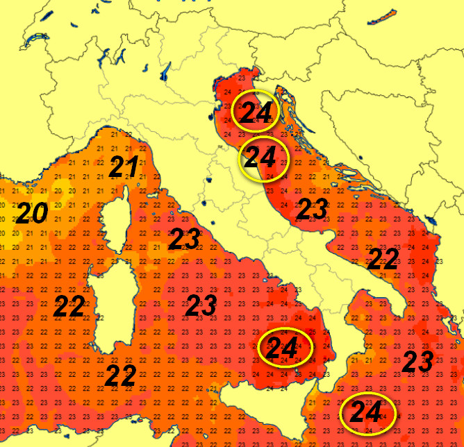 Punte di 24° (notevoli nella prima metà di giugno) sono presenti sull’alto-medio Adriatico, sul basso Tirreno e sullo Ionio. La punta più bassa tra il Mar Ligure e il Golfo del Leone con 20-21°. Nei prossimi giorni le temperature del mare tenderanno ad aumentare un po’ ovunque.