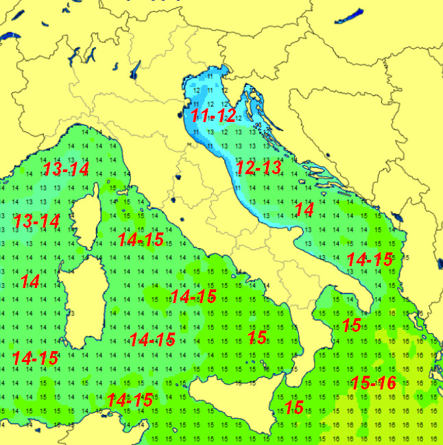 Lo specchio d’acqua più freddo è l’alto Adriatico con 11-12°; 12-13° si registrano sul medio Adriatico, 13-14° tra il Mar Ligure ed il Mare di Corsica, 14-15° sul resto del Tirreno ed il basso Adriatico, 15-16° sullo Ionio.