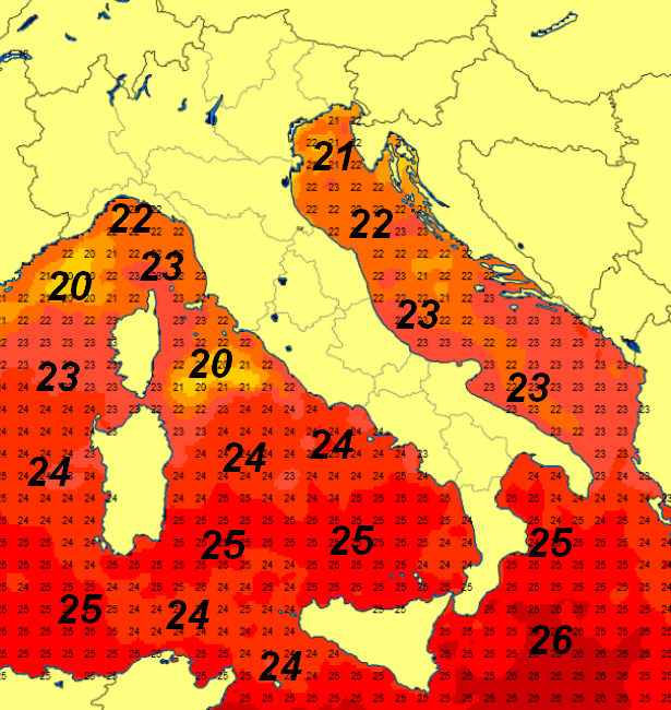 Temperature comprese tra i 20° del Mare di Corsica e del medio Tirreno ed i 26° del basso Ionio. L’aria fredda presente al momento sull’Italia dovrebbe determinare un più cospicuo calo dei valori termici superficiali nelle prossime 48 ore.