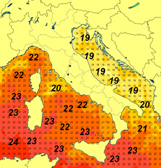 Più fresco il versante adriatico con valori attorno a 19-20°. Più caldo il Canale di Sardegna con 23-24°, gli altri settori presentano temperature superficiali comprese tra 21 e 23°.