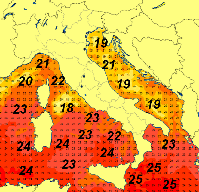 Continua il lento raffreddamento ed alcuni bracci di mare sono scesi sotto i 20°. La punta massima è presente sul basso Ionio con 25°.