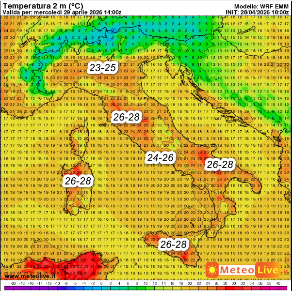 Ancora una giornata simil-estiva sull’Italia in attesa che l’aria fresca riporti il quadro termico a valori più ragionevoli. Punte di 26-28° saranno possibili nelle aree interne delle Isole, tra la Puglia e la Lucania unitamente alle zone interne della Toscana e del Lazio. Un lieve calo termico interverrà invece sulla Pianura Padana, ma con valori sempre superiori alla media del periodo.