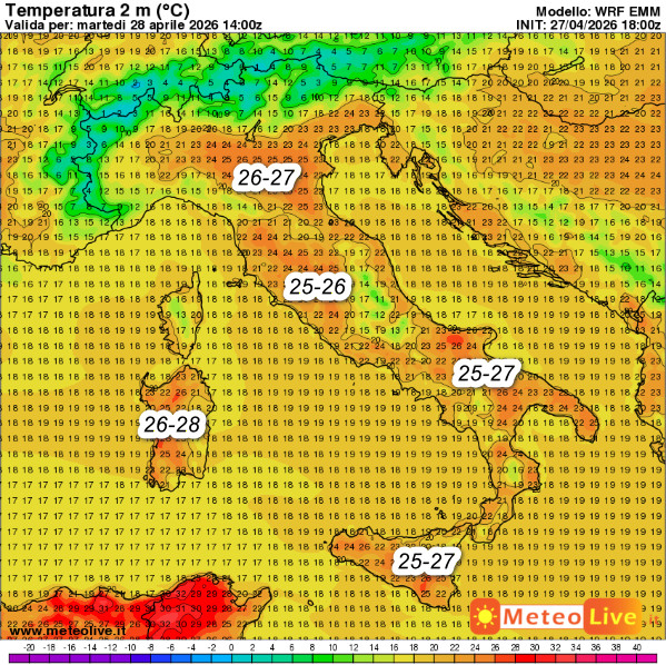 08:26 28 Aprile 2026 Le temperature delle ore 16: prosegue l’anticipo d’ESTATE su diverse regioni Paolo Bonino - Autore Temperature in calo sotto eventuali rovesci, ma ancora ampiamente oltre la media specie al nord-est, sulle Isole e le aree interne del centro-sud (26-28° alla portata).