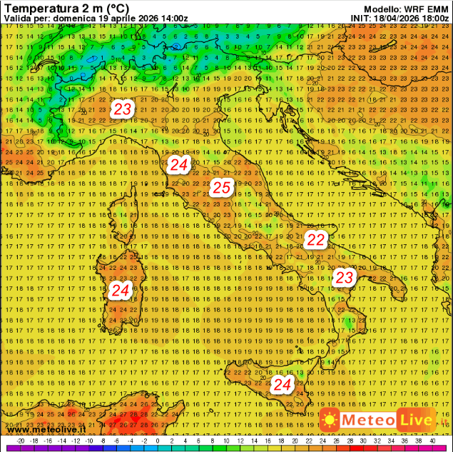 Alle ore 16 di domenica 19 aprile sono previste punte di 25° nelle aree interne della Toscana, 24° sulle Isole, 23° sulle pianure del nord-ovest. Più fresco sotto eventuali rovesci.